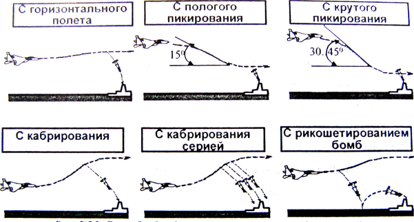 Бомбометание обычных бомб производится с кабрирования, с пикирования, с рикошетированием и серией (по площадям).