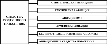 Средства воздушного нападения включают стратегическую авиацию, тактическую авиацию, авиацию ВМС, армейскую авиацию, беспилотные летательные аппараты (БЛА) и авиационные средства поражения (Рис.2 )