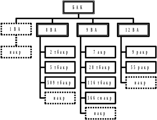 Организационно СА США входит в состав Боевого авиационного командования ВВС и Командования воздушных перебросок ВВС США, основными оперативными объединениями которых являются воздушные армии. В воздушные армии входят несколько авиационных крыльев, которые являются основной организационной тактической частью ВВС и в зависимости от стоящей на вооружении авиационной техники подразделяются на тяжелобомбардтровочные (тбакр), смешанные (смакр), разведывательные (ракр) и заправочные авиационные крылья (закр). Рис.6