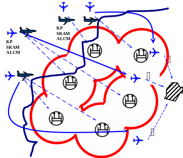 •преодоление бомбардировщиками первого эшелона ПВО и нанесение ударов по объектам в глубине страны. В этом случае подавление средств ПВО предусматривается ракетами SRАМ, а в перспективе УР типа 8КАМ-2и АLARМ, поражение объектов в глубине страны ракетами АLСМ, а в приграничных, приморских районах, в основном ядерными бомбами. При этом пуск ракет и бомбометание могут осуществляться как с больших, так и с малых высот;