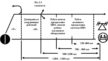 Мероприятия по преодолению системы ПВО начинаются с рубежа пассивного обнаружения самолетов, т.е. с рубежа, начиная с которого электромагнитное излучение бортовых систем РЭС бомбардировщиков могут быть обнаружены наземными средствами радиотехнической разведки ПВО.