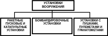В состав установок вооружения входят: ракетные пусковые и катапультные установки, бомбардировочные установки, установки с пушками, пулеметами и гранатометами.( Рис.3 )