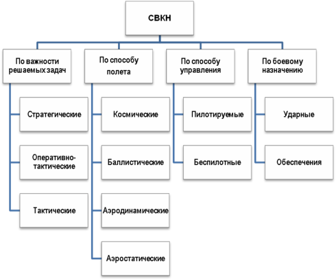 Современные СВКН принято подразделять на несколько групп по различным признакам: важности решаемых задач, боевому назначению, способу управления и способу полета (рис. 1) (зарисовать)