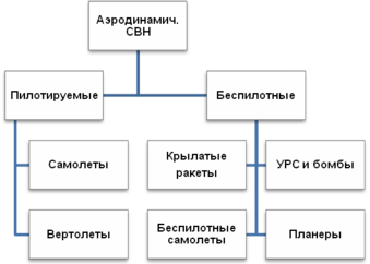Пилотируемые – самолеты и вертолеты. Беспилотные – крылатые ракеты, управляемые реактивные снаряды (УРС) и управляемые авиабомбы (УАБ) различных классов, беспилотные самолёты и планеры.