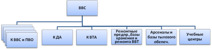 Организационно ВВС включают в себя четыре самостоятельных командований Военно-воздушных сил и ПВО, командования дальней и командования военно-транспортной авиации, ремонтные предприятия, базы, хранения и ремонта вооружения и военной техники, арсеналы и базы тылового обеспечения и учебные центры. (Рис.1)