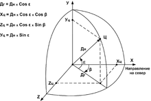 Азимут (β) - угол между направлением на север и проекцией наклонной дальности (Днакл) на горизонтальную плоскость, отсчитываемый по часовой стрелке.