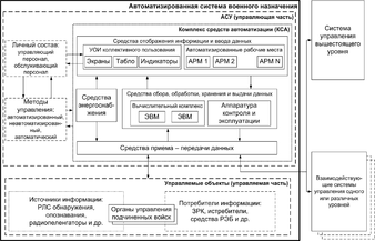 | 1.4) Назначение, структура и классификация АСУ. Основные определения: АСУ ВПВО, автоматизированный КП, КСА. АСУ предназначена для повышения оперативности и качества управления войсками или боевыми средствами в целях более полного использования их боевых возможностей. Под АСУ понимают систему «человек-машина», обеспечивающую эффективное функционирование объекта, в которой сбор и переработка информации, необходимой для реализации функций управления, осуществляются с применением средств автоматизации и вычислительной техники. АСУ военного назначения подразделяются на: