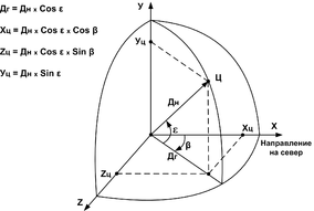 Азимут (β) - угол между направлением на север и проекцией наклонной дальности (Днакл) на горизонтальную плоскость, отсчитываемый по часовой стрелке.