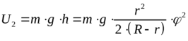Потенциальная энергия системы определяется энергией деформации растяжек и энергией изменения положения центра масс цилиндра. При повороте цилиндра на угол φ его верхняя точка перемещается на длину 2rφ. Причем, считая колебания малыми, будем считать, длину хорды и ее проекцию на горизонталь практически одинаковыми, тогда выражение для потенциальной энергии деформации растяжек принимает вид: