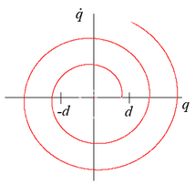 Процесс движения системы будет продолжаться до тех пор, пока она не остановится в зоне застоя. Как видим, за один период амплитуда уменьшается на величину 4d. Это говорит о том, что, в отличие от вязкого трения, уменьшение амплитуды происходит по закону арифметической прогрессии. Кроме того, отметим, что в этом случае частота колебаний равна частоте свободных колебаний консервативной системы. На фазовой плоскости движение системы с «сухим» трением отображается следующим образом: