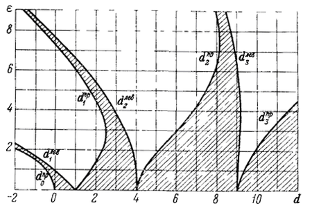 Решениями этого уравнения служат специальные функции, называемые функциями Матье, свойства которых подробно изучены. Так же, как и в предыдущем случае, эти решения могут быть или ограниченными, или неограниченно возрастающими. Выделение соответствующих этим случаям областей параметров и приводит к диаграмме устойчивости, носящей имя Айнса-Стретта. Эта диаграмма симметрична относительно оси :