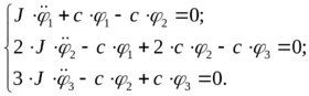 Три маховика с моментами инерции J, 2J и 3J соединены валами, каждый из которых имеет крутильную жесткость c. Определить собственные формы системы.