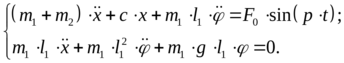 Составим систему уравнений движения, используя уравнение Лагранжа II-го рода. В качестве обобщенных координат удобнее всего принять горизонтальное отклонение массы от положения равновесия x и угол отклонения маятника .
