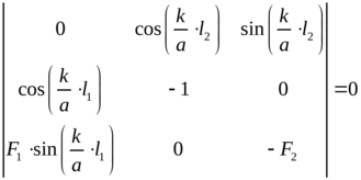 В случае, если стержень состоит из нескольких участков различного сечения, составляют амплитудные функции для каждого участка. Эти выражения будут содержать 2n постоянных интегрирования, которые определяются из условий сопряжения участков и условий закрепления концов стержня. Это приводит к системе из 2n уравнений относительно постоянных интегрирования. Приравняв к нулю определитель этой системы, получим частотное уравнение.
