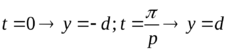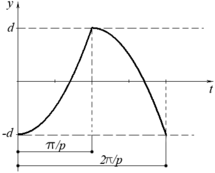 Условие отсутствия такого режима определим для случая кинематического возбуждения колебаний без демпфирования, считая, что упоры являются весьма жесткими и удар о них определяется коэффициентом восстановления скорости. Тогда при кинематическом возбуждении с частотой p график перемещения между упорами защищаемого объекта будет иметь вид:
