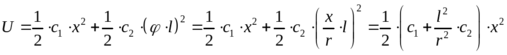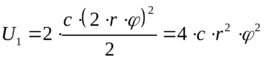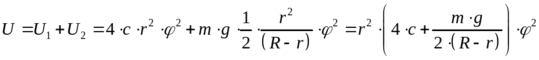 Потенциальная энергия системы определяется энергией деформации растяжек и энергией изменения положения центра масс цилиндра. При повороте цилиндра на угол φ его верхняя точка перемещается на длину 2rφ. Причем, считая колебания малыми, будем считать, длину хорды и ее проекцию на горизонталь практически одинаковыми, тогда выражение для потенциальной энергии деформации растяжек принимает вид: