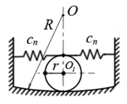Ц илиндр массой m и радиусом r лежит в желобе, имеющем радиус R. На верхней точке цилиндра закреплены две упругие растяжки жесткостью сп каждая. Определить частоту свободных колебаний системы, считая, что проскальзывание цилиндра по поверхности отсутствует.