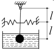 Н а абсолютно жестком стержне длиной 2l подвешен груз массой m. К середине стержня прикреплены две пружинки жесткостью с каждая. Груз находится в сосуде с вязкой жидкостью. Определить коэффициент вязкого трения системы, если период затухающих колебаний Т=1 с. Масса груза m=10 кг, длина l=15 см, диаметр пружины D=2 см, диаметр поперечного сечения витков d=2 мм, модуль упругости пружины G=8∙106 Н/см2, число витков i=6.