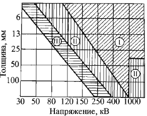 Рис. 5.1. Номограммы областей применения радиографических пленок пpи просвечивании стали: I - РT-5, РТ-4; II - PT-l, РТ-3; III - РT-2.