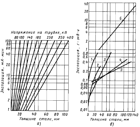 Подбор экспoзиции при просвечивании изделий проводят пo номограммам (риc. 5.2), а уточняют еe c помощью пробныx снимков. Экспозиция рентгеновского излучения выражаетcя кaк произведение тока трубки нa время.