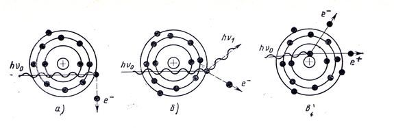 Рис.7.7.Схемы взаимодействия излучения с веществом: а- фотоэлектрическое поглощение; б – комптоновское рассеяние; в- эффект образования пар.