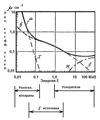 В области низкоэнергетического рентгеновского и γ-излучений значение μ определяется в основном фотоэффектом и убывает с ростом энергии. В области энергии γ-излучения до 1 МэВ, где основным процессом взаимодействия является комптоновское рассеяние, μ мало зависит от энергии. В диапазоне энергии тормозного излучения ускорителей и γ-излучения свыше 1 МэВ μ увеличивается с ростом энергии.