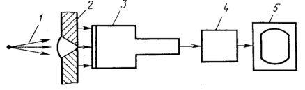 1 – излучение, 2 – сварное соединение, 3 – рентген-видикон, 4 – блок связи, 5 – информационная телевизионная система