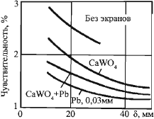 Рис. 8.8. Влияние усиливающих экранов на чувствительность радиографического метода при просвечивании стали -излучением 154Eu: