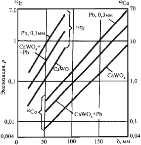 Рис. 8.9. Зависимость экспозиции от толщины стали для различных экранов и источников излучения