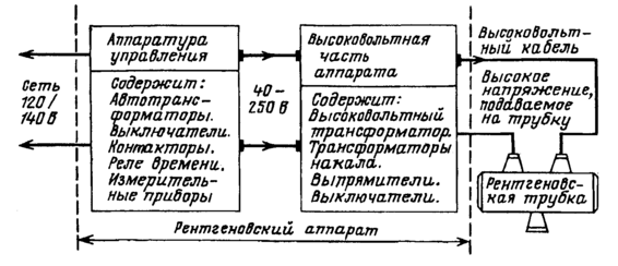 Рентгеновские аппараты. Рентгеновская установка состоит из рентгеновского излучателя, источника высокого напряжения и пульта управления (рис. 7.14). Высоковольтный генератор преобразует напряжение сети в высоковольтное напряжение для питания постоянного тока рентгеновской трубки. Высоковольтный генератор включает: преобразователи переменного тока в постоянный (диоды кенотронов), конденсаторы для фильтрации и удваивания напряжения, трансформаторы накала рентгеновской трубки, трансформаторы накала кенотронов, выключатели и защитные устройства.