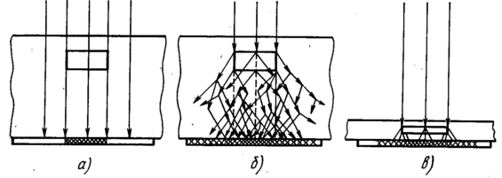 Рассеянное излучение в зависимости от энергии первичного излучения изменяет качество снимка, снижает контрастность и четкость изображения, а следовательно, и чувствительность самого метода, при отсутствии рассеяния дефект на пленке будет изображаться с четкими границами (рис.8.1).