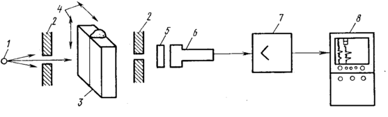 Рис. 7.12. Схема радиометрического метода контроля:1 – источник излучения, 2 – коллиматоры, 3 – контролируемый объект, 4 – направления перемещения, 5 – сцинтилляционный кристалл, 6 – фотоэлектронный умножитель, 7 – усилитель, 8– регистрирующий прибор