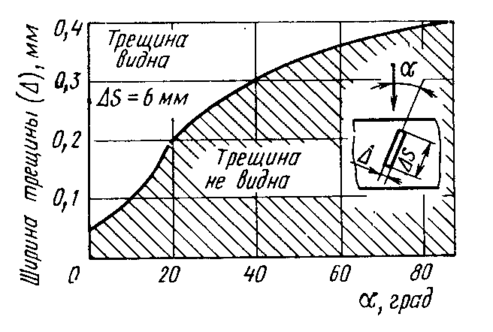 Наилучшая выявляемость наблюдается при прохождении излучения вдоль дефектов, т.е. когда угол α (рис.8.5) равен 0. При ориентации дефекта под некоторым углом к направлению излучения выявляемость ухудшается; в этом случае пучок излучения будет проходить не всю высоту (ΔS), а только определенную часть ее. Чувствительность просвечивания при этом будет определяться шириной раскрытия дефекта (Δ). В практике очень часто встречаются дефекты, у которых ширина раскрытия (Δ) незначительна при достаточно большой высоте (ΔS).