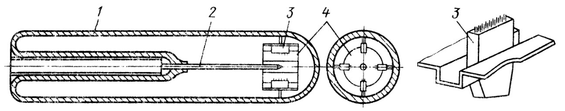 Рис.7.15. Схема импульсной рентгеновской трубки: 1 – баллон, 2 – анод, 3 – игольчатые катоды, 4 – катодный держатель.