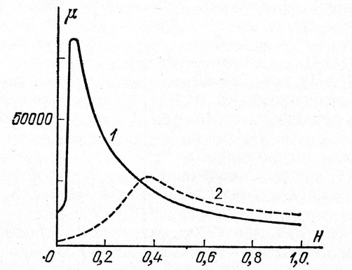 Как мы видим, магнитная проницаемость имеет малые значения в слабых полях, затем нарастает до максимального значения и при дальнейшем увеличении поля снова уменьшается.