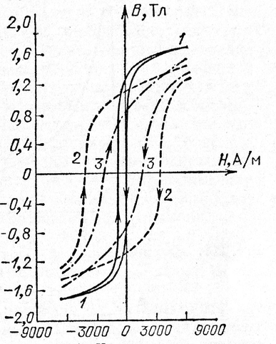 Процесс намагничивания вещества можно характеризовать кривой зависимости J и Н, но и кривой зависимости В и Н. На рисунке 9.6 показана зависимость В и Н для различных сортов стали.