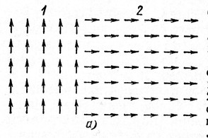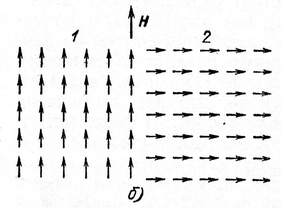 Рис. 9.8. Схема ориентации молекулярных магнитов в областях самопроизвольного намагничивания 1 и 2: а) внешнее магнитное поле отсутствует, б) под действие внешнего магнитного поля области 1 и 2 перестраиваются