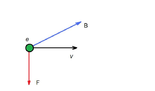 Сила Лоренца, действующая на электрон е, движущийся в магнитном поле, перпендикулярна к скорости электрона υ и к магнитной индукции В.