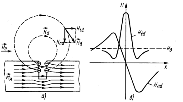 Рис. 10.1. Распределение намагниченности Ми в ферромагнитном изделии и поля рассеяния Hd над поверхностным дефектом (а), а также топография (б) тангенциальной Htd и нормальной Hnd составляющих напряженности поля поверхностного дефекта