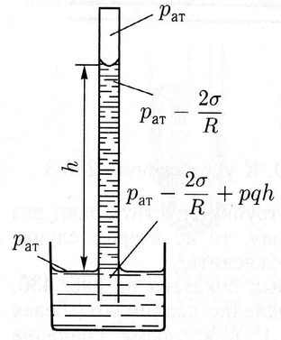 Примем, что поверхность жидкости внутри капиллярной трубки имеет строго сферическую форму, радиус которой равен радиусу капилляра (рис. 11.10). Непосредственно под вогнутым мениском давление жидкости меньше атмосферного давления рат на величину 2σ/R, т. е. равно рат — 2σ/R. На глубине h, соответствующей уровню жидкости в широком сосуде, к этому давлению прибавляется гидростатическое давление ρgh. В широком сосуде на том же уровне, т. е. непосредственно под плоской свободной поверхностью жидкости, давление равно атмосферному давлению рат. Так как имеет место равновесие жидкости, то давления на одном и том же уровне равны. Следовательно
