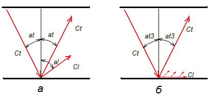 Существует еще один замечательный угол. Он относится к углу распространения поперечной волны в металле. Поперечна, распространяющаяся в металле, отражаясь от границы пластины, частично трансформируется в продольную (рис. 2.7. а). Но существует такой угол, при котором трансформированная продольная волна распространяется вдоль поверхности (головная волна) (рис. 2.7.б). Такой угол назвали третьим критическим углом.