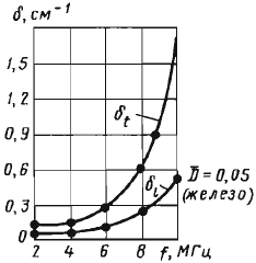 Значение δ в большой мере определяет частоту УЗ колебаний. С одной стороны, с увеличением частоты возрастает амплитуда сигнала вследствие улучшения направленности излучения, а с другой, уменьшается амплитуда сигнала из-за увеличения затухания.