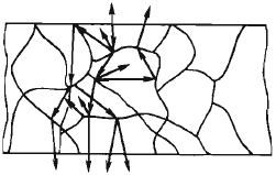 В металле кристаллы ориентированы различным образом, поэтому при переходе ультразвука из одного кристалла в другой скорость звука может меняться в большей или меньшей степени. B результате возникают частичное отражение, преломление и трансформация ультразвука, что обусловливает механизм рассеяния (рис. 3.3).