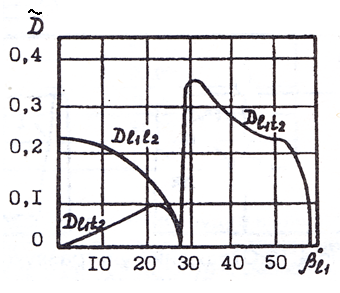 Если используется SV –волны, у которых плоскость колебаний лежит в плоскости чертежа (в плоскости падения), что характерно для поля обычного наклонного ПЭП, то коэффициент отражения сигнала R меняется по закону как показано на рисунке 3.2. сплошной линией. Если плоскость колебаний ортогональна плоскости падения (SН-волны), то он не зависит от β, т.е. R = 1.