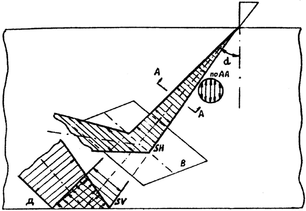 Если вектор колебательной скорости параллелен плоскости отражателя, то такие волны называются SН- волнами. Одна и та же волна в зависимости от ориентации плоскости отражателя может быть по отношению к ней SV или SН поляризованной. На рис. 3.1. поляризованная в плоскости чертежа поперечная волна является SV волной для донной плоскости Д перпендикулярной плоскости чертежа и вектору колебательной скорости. В то же время, она является SН волной для плоскости В параллельной вектору колебательной скорости.