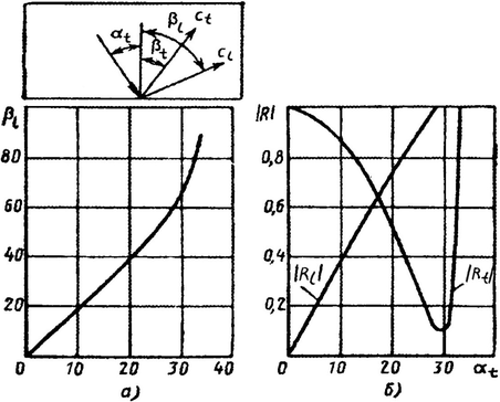 Рис.3.2. Зависимости угла β1(а) и коэффициента отражения R(б) от угла αt.