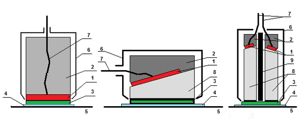 Рис. 4.1 Конструкции основных разновидностей ПЭП – a) – прямой, б) – наклонный и в) – разделно-совмещенный.