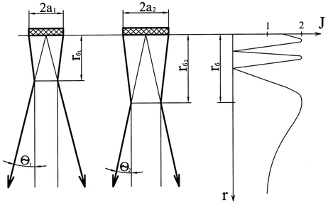 Рис.4.2. Акустическое поле вблизи излучателя: 2а1<2а2, θ1>θ2.