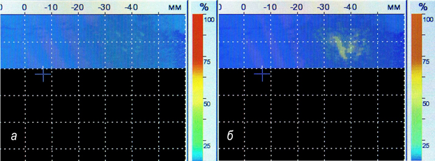 Рис. 5.9. УЗ томограммы сварного шва листов углеродистой стали толщиной 20 мм, полученные с помощью антенной решётки поперечных волн: а – область без дефектов; б – область с дефектом типа непровар.