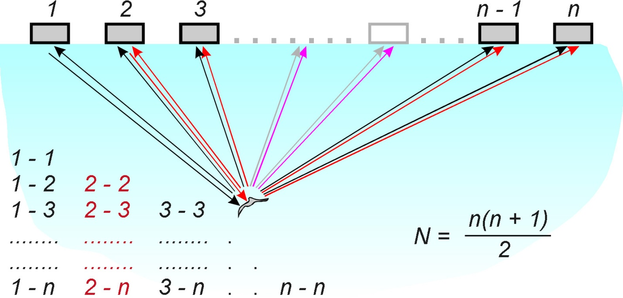 На рис. 5.10 показана схема антенной решётки. Стрелки на схеме символизируют распространение УЗ сигналов от излучающего элемента к приёмному в процессе её работы. При количестве элементов решётки равном n общее количество принятых реализаций УЗ сигналов при полном переборе всех возможных комбинаций излучатель – приёмник равно